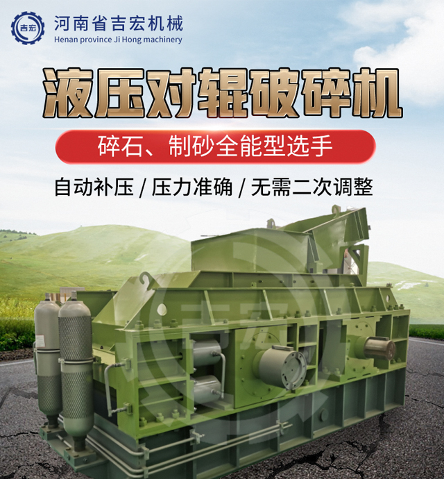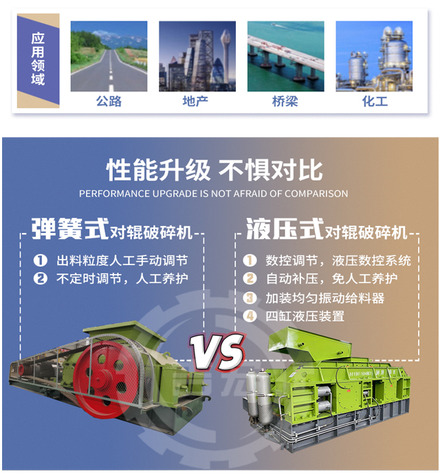 對輥式破碎機將破碎物料經給料口落入兩輥子之間,進行擠壓破碎,成品物料自然落下。遇有過硬或不可破碎物時,對輥式破碎機的輥子可憑液壓缸或彈簧的作用自動退讓,使輥子間隙增大,過硬或不可破碎物落下,從而保護機器不受損壞。相向轉動的兩輥子有一定的間隙,改變間隙,即可控制產品最大排料粒度。
